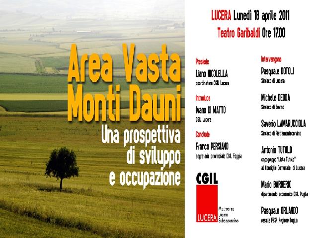 La Camera del Lavoro-CGIL di Lucera ritiene di fondamentale importanza dare una svolta all’esperienza dell’Area Vasta Monti Dauni, stimolando l’opinione pubblica, gli enti locali e le organizzazioni di categoria ad un maggiore impegno programmatico e progettuale, finalizzato ad un più efficiente utilizzo dei fondi per lo sviluppo regionale stanziati dall’Unione Europea per il periodo 2007-2013.