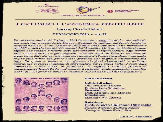 Venerdì 27 maggio, sempre alle ore 19, sarà di scena prof. Angelo Giuseppe Dibisceglia, docente di Storia della Chiesa negli Istituti Superiori di Scienze Religiose di Foggia, di Trani e di Bari, per una conferenza su «I Cattolici e la Costituente». L’evento, organizzato in collaborazione con il Centro Italiano Femminile di Lucera e con il patrocinio dell'Associazione culturale Terzo Millennio di Lucera nasce dalla volontà di ricordare, insieme al Referendum Istituzionale e dell'elezione dell'Assemblea Costituente del 2 giugno 1946, anche i settant’anni dalla promulgazione del decreto Bonomi sul diritto al voto delle donne in Italia.