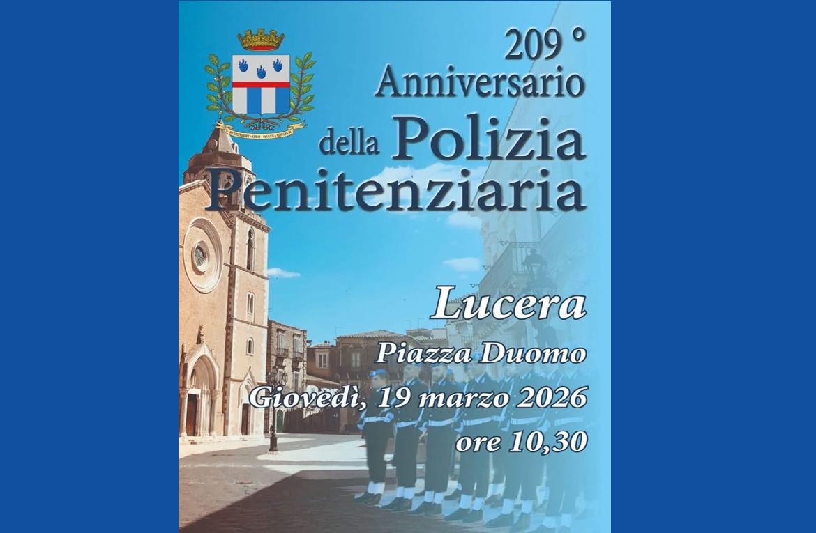 Lucera - Il 19 marzo 2026, alle ore 10.30, in piazza Duomo a Lucera, sarà celebrato ll 209" Anniversario della Fondazione dei Corpo di Polizia Penitenziaria unitariamente per gli istituti penitenziari di Lucera, Foggia e San Severo.