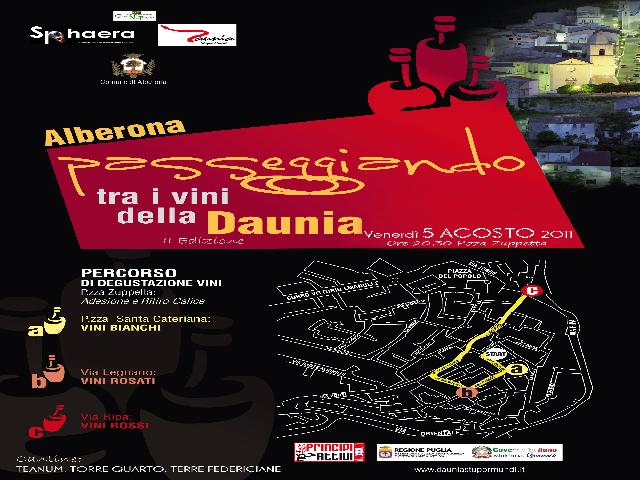 I vini della Capitanata, le vie e le piazze di uno dei “Borghi più belli d’Italia”, i sapori del territorio: sono questi gli ‘ingredienti’ di “Passeggiando tra i vini della Daunia” che si terrà ad Alberona venerdì 5 agosto, dalle ore 20.30. L’iniziativa è alla sua seconda edizione. L’evento è stato organizzato dall’associazione di promozione sociale “Sphaera”, nell’ambito del progetto “Daunia Stupor Mundi”, in collaborazione con l’associazione “Giovani nel tempo” e il patrocinio del Comune di Alberona.