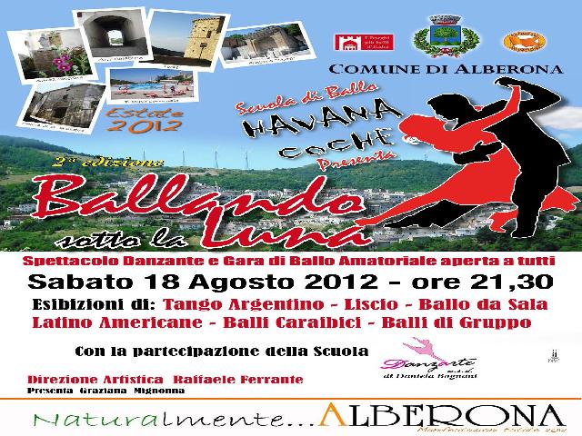 Sarà una notte all’insegna della danza quella di sabato 18 agosto, ad Alberona, dove si terrà la seconda edizione di “Ballando sotto la luna”. Lo spettacolo danzante e la gara di ballo sono state organizzate dalla scuola di ballo “Havana Coche” che farà scendere in pista i suoi migliori ballerini con l’esibizione dei maestri Lucia Frascone, Giovanni di Pasqua, Antonella De Felice, Raffaele Ferrante, Simone Gentile e Giovanni Carbonara. Alla serata parteciperà anche la scuola Danzarte di Daniela Bognani. Spazio a tutte le danze del mondo con la passionalità del Tango Argentino, l’allegria dei balli caraibici, la forza trascinante dei balli di gruppo, l’eleganza del ballo da sala e, ancora, i ritmi del liscio e dei latino-americani. Direttore artistico dell’evento è Raffaele Ferrante e la serata sarà presentata da Graziana Mignogna. Oltre alle esibizioni dei maestri, si svolgerà la gara di ballo amatoriale aperta a chiunque volesse misurare le proprie abilità. “Ballando sotto la Luna” prenderà il via alle 21.30 e sarà preceduto dalla “Festa della Mozzarella in piazza”. Il programma degli eventi estivi alberonesi proseguirà anche domenica 19 con tre diversi appuntamenti: dalle ore 9 alle 16, la Sezione Cacciatori – Agro di Alberona sarà protagonista di una “Gara di tiro al piattello”; dalle ore 10, invece, comincerà la raccolta fondi dell’associazione “Ant” in ricordo della professoressa Maria Bambina Scrocco; dalle ore 21.30, poi, tutti in Piazza Civetta per partecipare e assistere a “Lasciateci cantare”, spettacolo diretto organizzato da Leonardo Genovese con la direzione artistica di Giovanni Pece. Lunedì 20, sempre dalle ore 21.30, torna “Alberona’s got talent”, la manifestazione che lo scorso anno ebbe uno straordinario successo convincendo molti giovani e giovanissimi a mostrare il proprio talento per il canto, il ballo e la recitazione. “Alberona’s got talent” è organizzato dall’associazione alberonese “Giovani nel Tempo”. Fino al prossimo 9 settembre, Alberona” offrirà cinquanta giorni di musica, appuntamenti culturali, sport, animazione per i più piccoli, teatro, cinema e serate del gusto. Il cartellone degli eventi è stato organizzato dal Comune di Alberona con la collaborazione dei ristoratori, degli operatori turistici del borgo e di numerose associazioni tra cui Giovani nel Tempo, Pro Loco, sezione alberonese di Italia Nostra, Associazione Podistica Lucera, Comitato Promotore “Club Unesco” di Alberona, Rotaract di Lucera, Sezione Cacciatori, Associazione Ant e Comitato Emigrati Alberonesi.