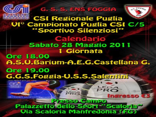 Si disputerà sabato 28 maggio 2011 la 1^ giornata del torneo di calcio a 5 "Silenziosi". Il torneo organizzato dai vari Comiatati di zona in collaborazione con il Comitato Regionale del Centro Sportivo Italiano, riservato ai diveramente abili (sordi) è giunto alla VI^ edizione e vedrà la partecipazione di 5 società provenienti da tutta la Regione Puglia : Us. Sordi Salentini (Lecce) - ASD Sporting United Barium (Bari) - GS. Sordi Monopoli - ASD Effe Gi. Castellana - GS Ens Foggia. La prima giornata verrà disputata a Manfredonia presso il Palazzetto dello Sport di via Scaloria a partire dalle ore 18,00 di sabato 28 maggio 2011, mentre il torneo finirà il 2 luglio 2011. A dirigere le gare del concentramento di Manfredonia sono stati chiamati gli arbitri del CSI Lucera - Foggia.