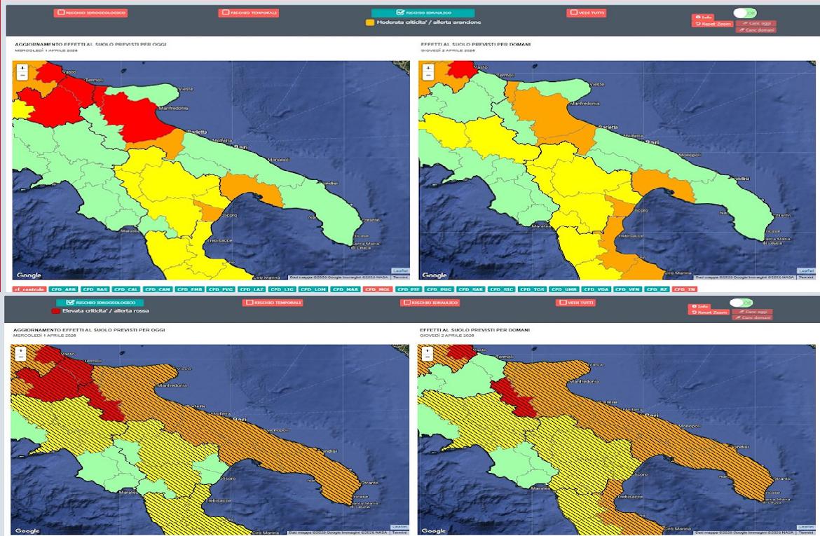 Per la giornata di oggi, 1 aprile, per rischio idraulico ALLERTA ROSSA su Puglia B (Tavoliere e bassi bacini del Candelaro, Cervaro e Carapelle) e Puglia I (Basso Fortore) e ALLERTA ARANCIONE su Puglia G (Basso Ofanto) e Puglia E (Bacini del Lato e del Lenne).