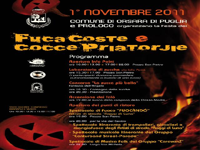 La musica di “Conturband” e “Caravanz”, i trampolieri e i mangiafuoco di “Raggi di luna”, lo spettacolo dei “Fuocandò” e il conto alla rovescia per l’accensione dei falò: ora è davvero tutto pronto per la notte di martedì 1 novembre, quella in cui a Orsara di Puglia si celebra l’antichissima festa dei “Fucacoste e cocce priatorije” (in italiano, “Falò e teste del purgatorio”). Le ore che ci separano dalla notte compresa tra l’1 e il 2 novembre sono le più speciali dell’anno per gli orsaresi. Tutti sono indaffarati nei preparativi. Le famiglie cercano di accaparrarsi le zucche migliori per i propri bambini. Saranno i più piccoli, con l’aiuto di nonni e genitori, a intagliare queste grandi “mongolfiere” arancioni per renderle “umane”, dotarle di occhi, naso, bocca e adeguarle a ospitare un lume al loro interno. La preparazione delle “cocce priatorije” è solo una delle incombenze da assolvere: affinché la festa sia perfetta, come vuole la tradizione, occorre accatastare per tempo tutto il legname necessario a preparare un falò che faccia invidia a quello del vicino. E poi non bisogna dimenticare vino, carne, pane, patate e dolci tipici, tutte le pietanze e gli ingredienti che saranno consumati nella notte del 1° novembre, quando in ogni stradina del borgo medievale si terrà un banchetto a base di piatti “poveri” ma gustosi e in tutto il paese saranno esposte centinaia di zucche lavorate in modo creativo e illuminate al loro interno. Gli orsaresi, gelosi e orgogliosi custodi delle loro antiche tradizioni, ogni anno, in questo periodo, si affannano a spiegare ai visitatori che il significato profondo della loro festa non ha nulla a che fare con “Halloween”, ormai diventata un appuntamento commerciale. L’evento che si celebra a Orsara di Puglia, al contrario, è ancora profondamente legato al culto dei defunti e rifugge decisamente dal “rito” consumistico del “dolcetto o scherzetto”. Uno dei momenti più suggestivi della festa è quello che scatterà alle 19: ai primi rintocchi delle campane della Chiesa Madre ci sarà l’accensione di un falò in ogni strada. Un consiglio pratico per quanti hanno intenzione di andare a Orsara a godersi lo spettacolo: è meglio arrivare presto in paese, perché da una certa ora in poi (20 - 20.30), esauriti i posti auto, diventa difficilissimo fare ingresso nel centro storico e trovare un posto libero per parcheggiare. L’attrazione che questo appuntamento esercita sulla gente è fortissima. Orsara di Puglia si trasforma, acquisendo le caratteristiche di un luogo magico. Davanti all’uscio di ogni abitazione si vedono grandi tavolate. Si mangia per strada, in una grande comunione collettiva che riempie il borgo di voci, risate, musica e allegria. E poi c’è il mistero di una notte che sembra davvero fare abbracciare due mondi: uno materiale e visibile, l’altro ultraterreno e impalpabile, ma pieno di suggestioni. La tradizione vuole che le anime del Purgatorio (Cocce priatorije) possano purificarsi attraverso il fuoco dei fucacoste e trovare la via del Paradiso, che viene indicata loro dai lumi nascosti dentro le zucche. E’ la festa della luce, dunque, non quella delle tenebre. In onore dei defunti, che in processione attraversano il paese dopo la mezzanotte, si consumano cibi poveri ma ricchi di significati simbolici: il grano lessato e condito col solo mosto cotto, le patate, le cipolle, le uova e le castagne cotte sotto la brace.