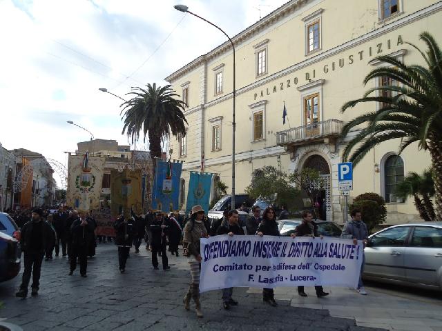 Significativa è stata anche la presenza della Chiesa, che, attraverso il suo Vescovo Mons. Domenico Cornacchia, ha voluto soprattutto ribadire la sua solidarietà verso popolazioni già in seria difficoltà e private dei servizi più elementari, quali strade, collegamenti viari, carenza di scuole primarie, nonché afflitte da una spaventosa disoccupazione che costringe i giovani a lasciare il territorio, a scapito di ogni possibilità di sviluppo. Togliere l’ospedale in questa situazione significherebbe davvero commettere un atto di ingiustizia gravissimo per il quale i politici regionali non avrebbero alcuna giustificazione. Inoltre, dovremmo capire perché bisognerebbe chiudere Lucera e non San Severo o Manfredonia, ad esempio, posto che sul piano della qualità non presentano particolari credenziali e in termini di condizione sociale, per loro fortuna, presentano un quadro migliore.