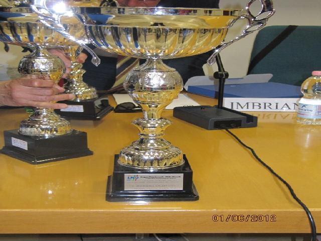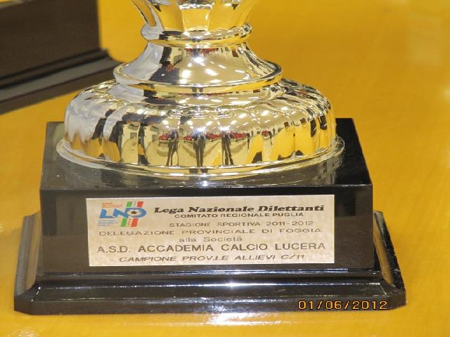 Festeggiamenti in casa dell’ Accademia Calcio Lucera, che nella Categoria Allievi ha conquistato il Titolo di Campione Provinciale e fatto suo il primato nella Classifica Disciplina tra i Giovanissimi. Ai trionfatori del calcio giovanile, genuino e lucerino verace, sono andate Coppa e Targa-premio, ritirate venerdì 01 giugno 2012 a Foggia. I Perna boys con i loro accompagnatori le hanno ricevute dalle mani dei massimi esponenti regionali e provinciali della Federazione Italiana Giuoco Calcio/Lega Nazionale Dilettanti: Cav. Vito Tisci, Presidente del Comitato Regionale Puglia L.N.D., il Prof. Antonio Quarto, Coordinatore Federale Regionale del Settore Giovanile e Scolastico, dott. Luciano Imbriano, delegato provinciale FIGC Foggia, dott. De Meo, Presidente Provinciale uscente del Comitato Arbitri, e dott. Italo Caratù, Consigliere Figc Puglia, nel corso di un’assemblea tenutasi per discutere le più ricorrenti problematiche inerenti l’attività sportiva giovanile. La cerimonia di premiazione si è svolta nei locali della Facoltà di Scienze Motorie della Università di Foggia. E’ stato un momento bellissimo per la neonata società lucerina, in un’ annata che ha segnato la conferma delle qualità di mister Michele Perna, uno dei migliori tecnici a livello giovanile in circolazione, coadiuvato dal Presidente del sodalizio Francesco Russo e dagli altri componenti della società: Giuseppe Vecchiarino, Raffaele Spagnuolo e Vincenzo Parente, senza dimenticare il contributo fattivo dei genitori, che per tutto l’anno hanno compiuto notevoli sacrifici per i propri figli sballottati da una parte all’altra a causa della non concessione dello Stadio Comunale da parte del Comune di Lucera. Va ricordato infatti che, nonostante ben quattro richieste, regolarmente protocollate al Comune di Lucera, non c’è stata alcuna risposta, snobbando l’ Accademia Calcio Lucera, come se fosse una “società fantasma”, come la definiva qualche “benpensante”……