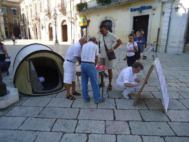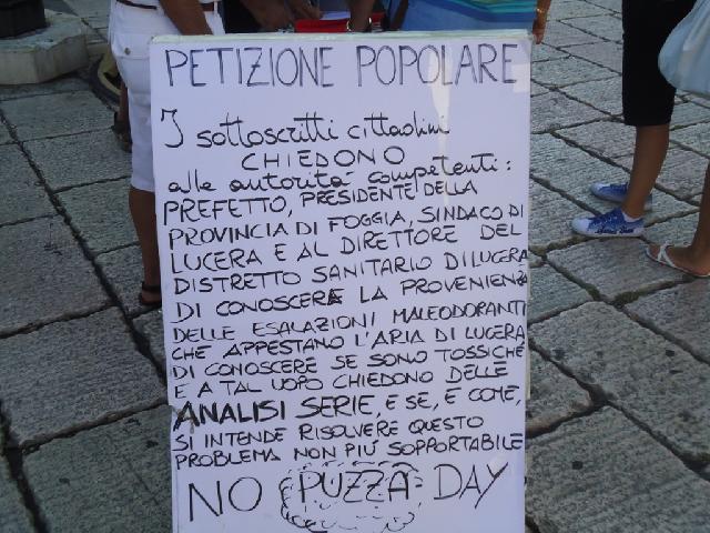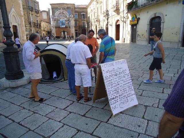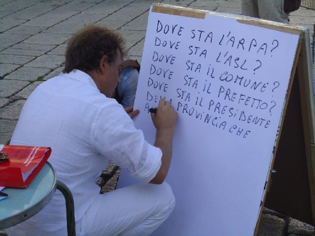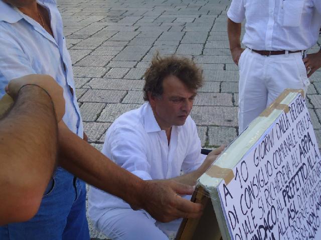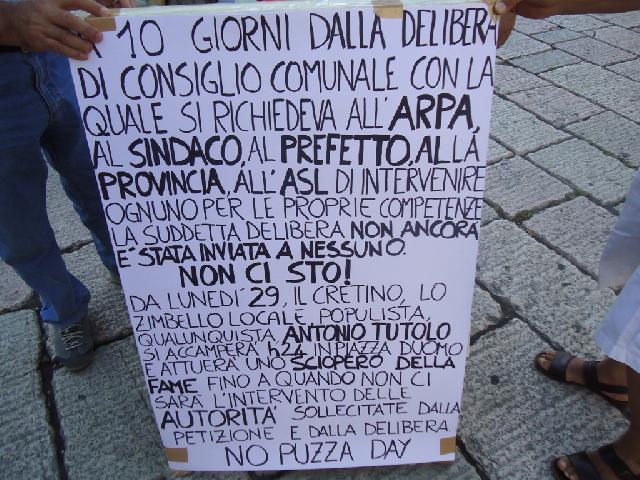Continua la protesta di Antonio Tutolo e della sua lista contro la ' Puzza ' che da qualche tempo invade regolarmente la città. Da questa mattina il commerciante di via Bovio si è ' accampato ' in piazza Duomo ed ha cominciato lo sciopero della fame che durerà fino a quando le istituzioni daranno una risposta ai tanti interrogativi che sono stati formulati e firmati nella petizione popolare del ' No Puzza Day' di qualche settimana fà. Nonostante siano passati dieci giorni dalla delibera con la quale il consiglio comunale richiedeva all'Arpa, al Sindaco,al Prefetto ed ai responsabili della ASL di intervenire ed effettuare delle analisi serie sulle emissione maleodoranti che quotidianamente invadono la città nessuno, secondo il leader della lista civica, delle autorità ed degli enti menzionati è intervenuto. Il commerciante di via Bovio che si è autodefinito ' lo zimbello locale, il populista, il qualunquista ' nel presidio di piazza Duomo continua a raccogliere firme per tenere desta l'attenzione su un fenomeno che rende l'aria della città irrespirabile.
