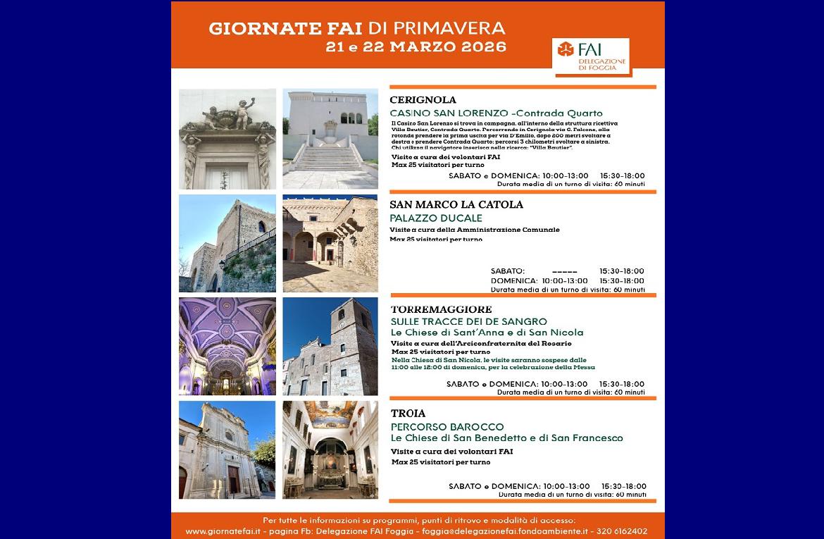 Anche quest’anno la Delegazione FAI di Foggia, in occasione delle Giornate FAI di Primavera, sabato 21 e domenica 22 marzo, in collaborazione con enti, associazioni, persone, garantisce l’opportunità di effettuare interessanti e stimolanti visite guidate in luoghi spesso poco noti e poco frequentati, alla scoperta del Bello di cui è ampiamente disseminata la Capitanata.