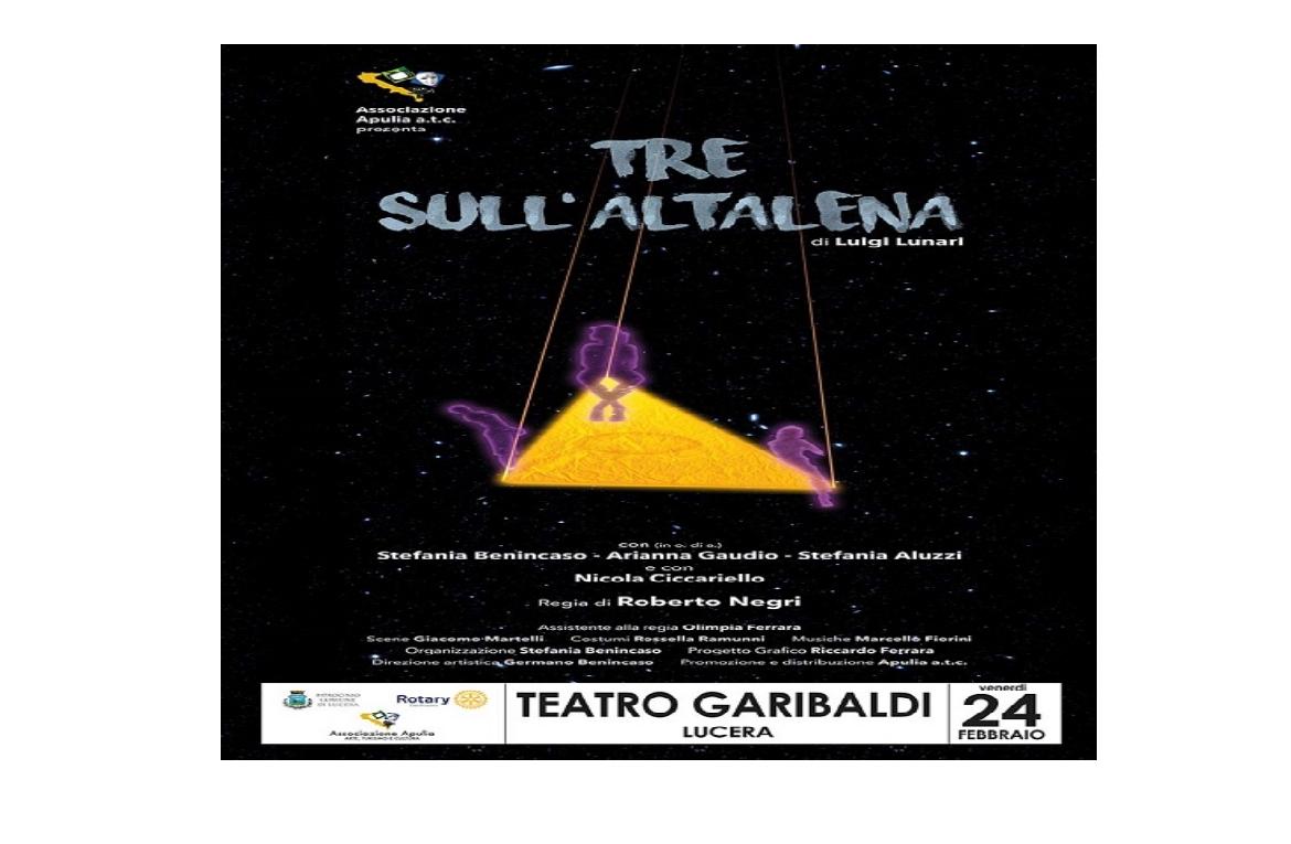 Le scenografie sono state realizzate da Giacomo Martelli, costumi di Rossella Ramunni, musiche originali di Riccardo Ferrara, assistente alla regia Olimpia Ferrara, direzione artistica di Germano Benincaso. La commedia “Tre sull’altalena”, prodotta da Stefania Benincaso con l’Associazione Apulia Arte, Turismo e Cultura, sarà rappresentata in anteprima nazionale a cura del Club Rotary di Lucera, venerdì 24 febbraio con inizio alle 20 al Teatro Garibaldi di Lucera. La rappresentazione, alle ore 20, sarà preceduta da un incontro con il pubblico al quale saranno presenti l’autore della commedia Luigi Lunari e il regista Roberto Negri. L’opera sarà replicata al “Garibaldi” sabato 25 febbraio con inizio alle ore 18,30 in collaborazione con la Fondazione Mediolanum e il Club Lions di Lucera. Ai due spettacoli si potrà assistere su invito. Entrambe le serate hanno ottenuto il Patrocinio del Comune di Lucera.