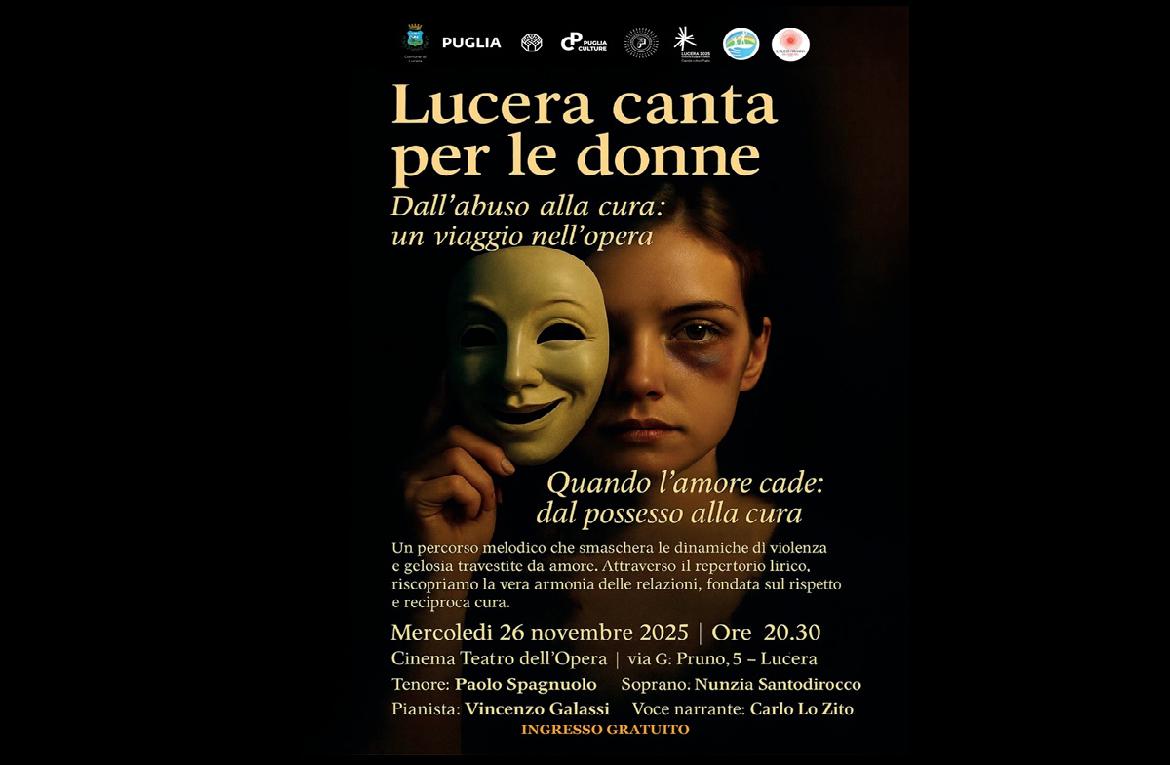 - In occasione della Giornata internazionale per l’eliminazione della violenza contro le donne, il Comune di Lucera – in collaborazione con l’Ambito territoriale “Appennino Dauno Settentrionale”, il Centro Antiviolenza “Giovanna Tanese” e la cooperativa sociale “Il Filo di Arianna”, soggetto promotore – promuove per la serata di martedì 26 novembre un recital lirico dal forte valore simbolico e civile.