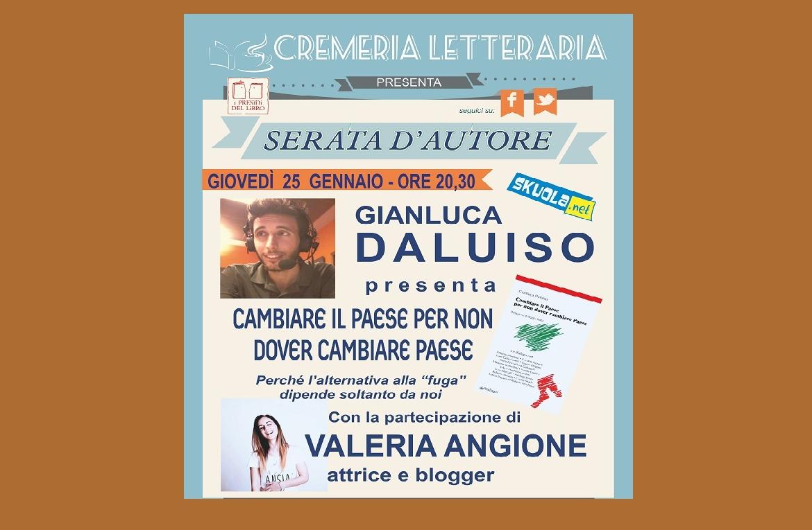 Cremeria Letteraria riprende la sua programmazione nel nuovo anno con una serata dal tema attualissimo e con una forte connotazione social. Giovedì 25 gennaio alle 20,30 Gianluca Daluiso giornalista del Fatto Quotidiano, presenterà il libro “Cambiare il Paese per non dover cambiare paese”, e sarà affiancato dalla giovane attrice e blogger napoletana Valeria Angione che con le sue irresistibili gag sul mondo degli universitari è seguitissima dai giovanissimi sui social.