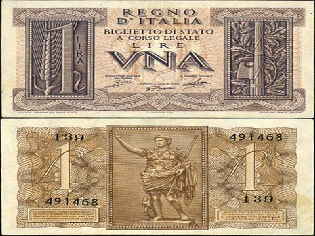 Con decreto del 14.11.1939 , nel 17° anno dell’era fascista, per la consacrazione dell’ impero ( S.Maestà Vittorio Emanuele III° imperatore d’Etiopia dal 1936 al 1946), le Officine dell’Istituto Poligrafico dello Stato di Roma stampavano un nuovo biglietto di Stato a corso legale da una lira chiamata stile “Impero”. Il nuovo biglietto 80x51 mm di colorazione variante di marrone, portava al diritto: a destra il fascio littorio tra rami di quercia, a sinistra una spiga di grano con l’uno, mentre al centro troviamo la dicitura del valore in lettere e sotto le firme del direttore generale del tesoro Grassi,visto per la Corte dei Conti Porena e il cassiere speciale Cossu. Al rovescio al centro troviamo la stampa di Cesare Augusto tra incrocio ornato a destra e sinistra delle lettere “B. S.”con la cifra 1 ripetuta più volte. La tiratura fu altissima di circa 800 milioni di pezzi. Il valore di mercato in fior di stampa si aggira intorno ai 15 euro. Spesso troviamo nei vari mercatini molti pezzi di questo biglietto di stato che al di là del valore ci riportano ad un tempo e a dei simboli della nostra passata storia patria.