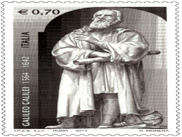 Il 15 febbraio 2014, l’amministrazione postale italiana ha voluto commemorare Galileo Galilei nel 450° anniversario della sua nascita. Il francobollo dentellato 13½ x 13½ di colore nero grigio ha un valore facciale da €.0,70. La tiratura complessiva è di 2.800.000 esemplari. Stampato dallo Istituto Poligrafico e Zecca dello Stato S.p.A. di Roma, in calcografia su carta patinata gommata, fluorescente su bozzetto di Rita Morena. La vignetta raffigura la statua di Galileo Galilei realizzata da Aristodemo Costoli, esposta nel Piazzale degli Uffizi a Firenze. Completano il francobollo la leggenda “GALILEO GALILEI”, le date “1564 - 1642”, la scritta “ITALIA” e il valore “ 0,70”. Galileo Galilei è nato a Pisa il 15/02/1564. A Firenze ebbe la sua prima formazione culturale umanistico-letterario. Nel 1581, si iscrisse alla facoltà di medicina dell'Università di Pisa, che abbandonò nel 1585. In precedenza aveva iniziato lo studio della matematica sotto la guida di O. Ricci, che lo avviò alla lettura delle opere dei Greci, in particolare di Archimede. Alternò l'interesse letterario con quello scientifico. Nel 1586 proseguì le ricerche di meccanica ideando la bilancia idrostatica per determinare il peso specifico dei corpi. nel 1586-87 scoprì alcuni teoremi sul baricentro. Nel 1589, con l’aiuto di Guidolbaldo Dal Monte ottenne la cattedra di matematica all'Università di Pisa. Galilei proseguì le sue ricerche sull'isocronismo del pendolo (l’ intuizione gli venne nel duomo di Pisa nel 1583,). Storiche restano le sue teorie astronomiche,tanto da scatenare le violente reazioni dell’inquisizione di Roma. Lo scienziato, avanti negli anni e di salute malferma si era reso “vehementemente sospetto d'heresia, cioè d'aver tenuto e creduto dottrina falsa e contraria alle Sacre e Divine Scritture, ch'il Sole sia centro della Terra e che non si muova da oriente a occidente, e che la Terra si muova e non sia centro del mondo”. Galilei fu costretto ad abiurare, e venne condannato alla prigione a vita, pena commutata prima in isolamento assoluto poi nella sua villa di Arcetri. Qui trascorse gli ultimi anni della sua esistenza fino alla sua morte avvenuta il 08/01/1642.