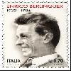 L’undici giugno del 2014, l’amministrazione postale italiana nell’ambito della sua programmazione filatelica annuale ha voluto commemorare il grande uomo politico italiano Enrico Berlinguer nei 30 anni dalla morte con l’emissione di un francobollo . Il francobollo policromo con dimensioni da 30 x 40 mm ha una dentellatura da 11 con fustellatura, è stato stampato in rotocalcografia presso l’I.P.Z.S. di Roma su carta bianca patinata neutra con autoadesivo. La tiratura complessiva è stata di 2.700.000 esemplari su bozzetto di FabioAbbati. la vignetta raffigura un ritratto di Enrico Berlinguer. Completano il francobollo la leggenda “ENRICO BERLINGUER”, le date “1922 - 1984”, la scritta “ITALIA” e il valore “€ 0,70”. Enrico Berlinguer (Sassari 25/05/1922-Padova 11/06/1984), si iscrisse al Partito Comunista nel 1943, l'anno seguente venne imprigionato per i moti antifascisti scoppiati a Sassari. Divenne Segretario della Federazione giovanile comunista dal 1949 al 1956 e fu tra il 1950 e il 1953 Presidente della Federazione mondiale della gioventù democratica. Nel 1945 entrò nel Comitato Centrale e nel 1948 nella direzione del Partito Comunista Italiano. Maturò una vasta esperienza politica come responsabile di vari settori del partito, fino a divenirne vicesegretario al XII Congresso ed eletto segretario al XIII Congresso tenutosi dal 13-17 marzo del 1972, succedendo nella carica all'onorevole Luigi Longo . Per la sua indiscussa personalità fu esponente di punta del comunismo europeo, fautore di una politica di superamento dei blocchi USA-URSS e di un'effettiva autonomia politica del partito nei confronti dell'Unione Sovietica. Berlinguer è stato l'ideatore e il promotore del “ compromesso storico” . Con il compromesso storico ,si era dissociato dai Paesi socialisti dell'Est, prevedendo la possibilità che l'Italia, democraticamente e gradualmente, avrebbe potuto accedere a una società più giusta superando le ingiustizie del capitalismo.