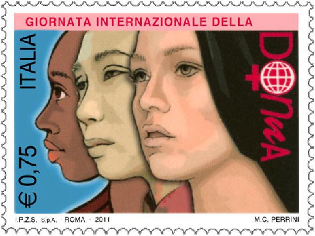 L’otto marzo 2011 festa della Donna,l’amministrazione postale ha emesso un francobollo dedicato alla giornata internazionale della donna. Stampato in rotocalcografia su carta fluorescente non filigranata, presso l’Istituto Poligrafico e Zecca dello Stato di Roma,ha una dentellatura di 13 x 13 ¼ e una dimensione di 40x30 mm. La tiratura totale è di 2.500.000 esemplari in fogli da 50 pezzi. Il valore di 0,75€ riporta nella sua vignetta policroma tre volti femminili che rappresentano dal punto di vista somatico la donna caucasica,la donna asiatica e in ultimo quella africana. All’interno sulla parola donna,la lettera “O” è stata integrata con un globo terrestre e il simbolo biologico femminile. La bozzettista è Maria Carmela Perrini, certamente uno dei talenti emergenti di via nazionale. La giornata internazionale della donna, comunemente definita festa della donna, ricorre l'8 marzo di ogni anno per ricordare sia le conquiste sociali, politiche ed economiche delle donne, sia le discriminazioni e le violenze cui esse sono ancora fatte oggetto in molte parti del mondo. Le reali origini della manifestazione, fanno riferimento alla morte di 146 operaie nel rogo di una fabbrica Triangle di camicie a New York,avvenuto storicamente il 25 marzo 1911, in gran parte giovani donne immigrate dall'Europa e tra loro molte italiane. A riconoscimento mondiale di questa festa, nel dicembre 1977, l'Assemblea generale delle Nazioni Unite proclamò una «giornata delle Nazioni Unite per i diritti della donna e la pace internazionale» da osservare dagli stati membri in un qualsiasi giorno dell'anno, in accordo con le tradizioni storiche e nazionali di ogni stato. Adottando questa risoluzione, l'Assemblea riconobbe il ruolo della donna negli sforzi di pace e riconobbe l'urgenza di porre fine a ogni discriminazione e di aumentare gli appoggi a una piena e paritaria partecipazione delle donne alla vita civile e sociale del loro paese. Auguri a tutte le Donne.