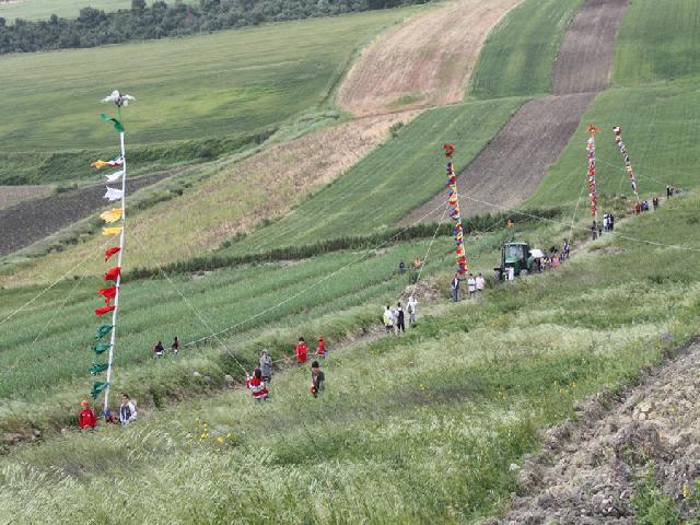PROCESSIONE NEL GRANO. Per arrivare lassù, ai piedi di un’antica torre che domina sui ruderi di un’antica città, devono camminare in mezzo alla campagna, attraversando il mare verde dei campi di grano ancora fresco. Il culto di Sant’Alberto si rinnova dal dodicesimo secolo. La tradizione vuole che, nel 1889, in seguito a una grave siccità, il popolo invocò l’aiuto di Sant’Alberto. Il santo apparve in sogno a due donne, dicendo loro che i fedeli avrebbero dovuto compiere un pellegrinaggio penitenziale ai ruderi di Montecorvino. Così fu e, il 16 maggio di 125 anni fa, il popolo di Pietramontecorvino, assieme ai fedeli giunti da Motta e Volturino, s’incamminò verso Montecorvino portando con sé la statua del patrono. Al ritorno il paese arrivò la tanto sospirata pioggia. L’usanza del palio ha origine dalla tradizione pagana in uso anticamente come rito propiziatorio della fertilità, confluito poi nella pratica cristiana. Le donne offrivano al santo i loro fazzoletti per chiedere che il patrono proteggesse i loro uomini in guerra. I palii, che oggi sono molti e raggiungono in alcuni casi i 20 metri, permettevano a chi restava in paese e non poteva partecipare alla processione, di individuare e di seguire la statua di Sant’Alberto a chilometri di distanza. Il palio veniva vestito con scialli e fazzoletti tenuti insieme con fasce per neonati. La raccolta dei fazzoletti per molti giovani era forse l'unica occasione per conoscere e incontrare le donne, il cui nome veniva appuntato a un angolo del fazzoletto su un pezzo di carta ed inserito poi, durante la vestizione, sotto la fascia con cui era avvolto il palio.