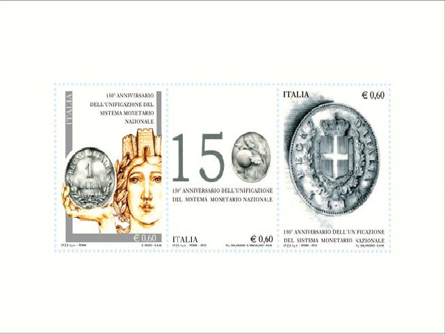 L’amministrazione filatelica italiana, nell’ambito della sua programmazione annuale, il 23 marzo del 2012 ha celebrato i 150 anni della nostra lira con l’emissione di un trittico filatelico in foglietto. Ogni francobollo ha il valore di €. 0,60.La tiratura ufficiale è stata di 2.000.000 di foglietti. Nei francobolli sono raffigurati alcune monete da una lira unità di conto del sistema monetale, emesse dopo la promulgazione della legge sull unificazione del sistema monetario del 24 agosto 1862 n. 788 e precisamente da sinistra a destra: - l’ Italia turrita, ispirata ad un busto tratto da una medaglia di Pio Tailetti degli anni ‘30, che tiene in mano il rovescio della moneta da una lira d’ argento emessa da Vittorio Emanuele II nel 1863, - composizione grafica del numero 150 dove lo zero è rappresentato dal rovescio della moneta da una lira del 1946 la prima emessa dalla Repubblica Italiana - rappresentazione grafica del rovescio di una moneta da una lira in argento emessa da Vittorio Emanuele II nel 1862. Completano ciascun francobollo la leggenda 150 ANNIVERSARIO DELLA UNIFICAZIONE DEL SISTEMA MONETARIO NAZIONALE, la scritta ITALIA e il valore € 0,60.I tre francobolli sono disposti in orizzontale, uniti tra di loro lungo il lato verticale ed impressi in un riquadro perforato posto al centro del foglietto. All’esterno dei dentellati sono riprodotti, rispettivamente in alto a destra e in basso a sinistra, i loghi della Repubblica Italiana e di Poste Italiane . Il bozzetto nasce da tre allievi della scuola dell’Arte della Medaglia dell’Istituto Poligrafico e Zecca dello Stato S.p.A. e precisamente: da Elisa Rizzo per il francobollo a sinistra, da Rosario Luca Salvaggio e da Serena Macaluso per il francobollo centrale e Rosario Luca Salvaggio per il francobollo a destra. La stampa è avvenuta presso l’ Istituto Poligrafico e Zecca dello Stato S.p.A., in rotocalcografia su carta fluorescente per l’intero foglietto. Ogni francobollo misura 40x48 mm ed hanno una dentellatura di 13 x 13½. Quanta nostalgia per la nostra e cara “LIRA”.