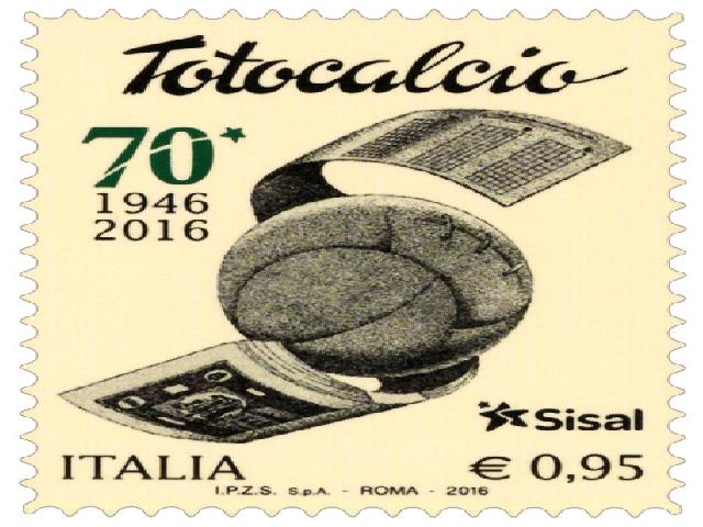 Il 5 maggio 2016 ,l’amministrazione postale italiana ha emesso un francobollo del valore di € 0,95 per festeggiare i 70 anni della nascita del totocalcio. La tiratura complessiva è stata di 600.000 esemplari. La vignetta del francobollo riproduce un particolare tratto dal supplemento del giornale “Sport Italia”, organo ufficiale dei pronostici SISAL, del campionato 1946-47, raffigurante un pallone di calcio entro un cartiglio formato, in alto, dalla storica schedina del Totocalcio e, in basso, da una serie di banconote; in alto, al centro, è presente lo storico logo del Totocalcio e, a seguire, a sinistra il logo del 70° anniversario e, in basso, quello del Gruppo Sisal. Completano il francobollo le date “1946 2016”, la scritta “ITALIA” e il valore “ € 0,95”. Il bozzetto è stato realizzato dal Centro Filatelico della Direzione Officina Carte Valori e Produzioni Tradizionali dell’Istituto Poligrafico e Zecca dello Stato . La stampa in rotocalcografia su carta bianca, patinata neutra, autoadesiva, non fluorescente è stata realizzata presso l’ Istituto Poligrafico e Zecca dello Stato S.p.A., in Roma. Il formato è di mm 30x 40 , dentellato da effettuata con fustellatura. Il totocalcio è un concorso pronostici o particolare forma di totalizzatore abbinato all'esito delle partite di calcio, noto anche come SISAL, dal nome della società ideata dal giornalista sportivo Massimo Della Pergola che lo lanciò in Italia il 5 maggio 1946. Dal 1948 la gestione è passata al CONI . Il concorso consiste nel designare sull'apposita schedina, in corrispondenza dei simboli 1, X, 2, rispettivamente il pronostico di vittoria delle prime squadre nominate nell'elenco delle 13 partite di calcio, di pareggio, di vittoria delle squadre seconde nominate. Le schedine sono divise in due tagliandi: il primo, che serve da ricevuta, reca l'elenco delle 13 partite della giornata, al cui fianco, in caselle contenenti i simboli 1, X, 2, il concorrente scrive il proprio pronostico; la convalida avviene per mezzo di un apparecchio elettronico che provvede anche a trascrivere il pronostico sia sul primo sia sul secondo tagliando che, sigillato da notai in armadi di sicurezza, serve al controllo delle vincite. Le giocate si effettuano nelle ricevitorie autorizzate. L'incasso lordo, ad avvenuto prelievo d'una percentuale per i ricevitori, è suddiviso in parti disuguali tra lo Stato, il CONI per il finanziamento dello sport italiano e il montepremi per la ripartizione tra le due categorie di vincitori con 13 oppure 12 risultati indovinati. La realizzazione del 13 e del 12 prevede rispettivamente 1.594.323 e 531.441 differenti combinazioni matematiche. Al totocalcio si sono aggiunti, dal 1994 il Totogol e dal 1998 il totosei. Dal 2004 il Totocalcio è abbinato al Totogol. Ricordo che da ragazzo la domenica ci radunavamo tutti a casa con amici e parenti per ascoltare nella radio le partite di calcio con il fiato sospeso fino al mitico novantesimo minuto, o per esultare per la vincita o per imprecare per la solita sfortuna…perché un tredici alla schedina allora ti cambiava la vita.