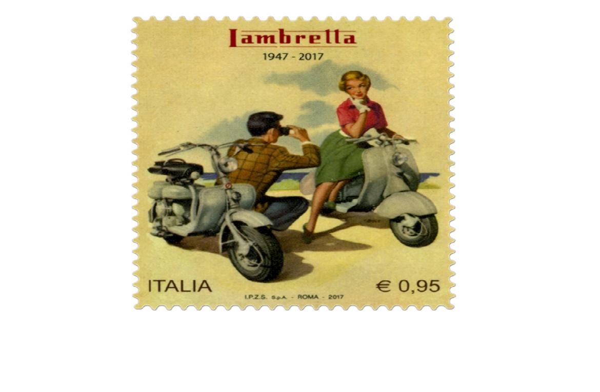 Il 03 giugno del 2017, l’amministrazione postale nell’ambito della sua programmazione filatelica annuale “le Eccellenze del sistema produttivo ed economico” ha voluto dedicare un francobollo ordinario policromo del valore di € 0,95 alla Lambretta nel 70° anniversario della sua produzione. La tiratura è stata di novecentomila esemplari. La vignetta riproduce un manifesto pubblicitario della Lambretta degli anni Cinquanta, realizzato dall’illustratore e cartellonista italiano Franco Mosca, conservato presso il Museo Scooter e Lambretta di Rodano. Completano il francobollo la leggenda “1947 - 2017”, la scritta “ITALIA” e il valore “€ 0,95”. Il bozzetto nasce dal Centro Filatelico della Direzione Officina Carte Valori e Produzioni Tradizionali dell’Istituto Poligrafico e Zecca dello Stato S.p.A. che ne ha curato anche la stampa in rotocalcografia su carta bianca, patinata neutra, autoadesiva, non fluorescente e dentellatura da 11 effettuata con fustellatura. La Lambretta è uno scooter, nato in Italia presso gli Stabilimenti della Innocenti con sede a Milano, nel quartiere Lambrate. Il nome "Lambretta" deriva dal fiume Lambro, che scorre nella zona dove sorgevano gli stabilimenti. Nel 1922 Ferdinando Innocenti di Pescia diede vita ad una fabbrica di tubi d'acciaio a Roma. Nel 1931 ritornò a Milano. Durante la seconda guerra mondiale ispirandosi ai moto scooter militari americani, decise di produrre un nuovo scooter. Nel 1947, dopo aver concluso la fase di progettazione, iniziò la produzione della Lambretta. Il successo fece sì che la Lambretta, nei quasi 25 anni di produzione, venisse costruita anche in Argentina, Brasile, Cile, India e Spagna. Sia la Vespa, che la Lambretta avevano un motore a 2 tempi funzionante a miscela di benzina e olio, 3 marce, con una cilindrata che variava dai 49 ai 198 cc. Diversamente dalla Vespa, realizzata con un telaio costituito da un solo pezzo, la Lambretta aveva una struttura tubolare più rigida su cui veniva assemblata la carrozzeria. I primi modelli presentavano la caratteristica "carrozzeria scoperta", distinguendosi dalla Vespa ,”totalmente carenata”. Oggi la Lambretta è un oggetto da collezionisti. Un'innumerevole quantità di Lambretta Club sparsi in tutto il mondo conserva ed alimenta il mito di questo storico scooter che, assieme alla Vespa , rappresenta inevitabilmente un'icona dell'Italia degli anni '50 e anni '60.