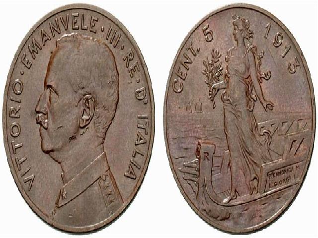 A distanza di ben cento anni, ci troviamo ad illustrare uno spicciolo molto usato e soprattutto molto presente nelle povere tasche delle classi meno abbienti. Lo spicciolo è la 5 centesimi Prora di Vittorio Emanuele III° millesimo 1913. Il cinque centesimi fu coniato a seguito del Regio Decreto n. 229 del 29 ottobre del 1908. Al diritto dello spicciolo troviamo il semibusto del Re in uniforme rivolto a sinistra e intorno in circolo la legenda VITTORIO • EMANUELE • III • RE • D'ITALIA. Al rovescio al centro campeggia una figura allegorica femminile simboleggiante l'Italia su di una nave con un ramoscello di ulivo nella mano destra. Sulla prua della nave segno di zecca in incuso (R), sulla fiancata indicazione degli autori P. CANONICA M. e E L. GIORGI I. in incuso. In alto lungo il bordo indicazione del valore (CENT. 5) e millesimo. La monetina in Nichel(950/1000) ha il contorno liscio,un diametro di 25 mm e pesa 5 grammi. Questo particolare millesimo (vedi foto)presenta una variante molto ricercata dai numismatici.Pochi esemplari, arrivati fino a noi,mostrano la moneta senza punto tra la D’ e ITALIA, forse per un errore dell’incisore L. Giorgi. Essendo questa variante molto rara, a differenza della versione col punto, che è comunissima, in commercio si trovano esemplari alterati , senza il punto. Sicuramente per il dritto è stato usato un solo conio che non presentava il punto. Molto probabilmente anche per il Rovescio è stato usato un solo conio che è possibile individuare tramite alcuni piccoli particolari. Per cui chi volesse acquistare questa stupenda monetina senza punto, si rivolga solo a professionisti numismatici che rilasciano certificato peritale, onde evitare di finire nelle grinfie di qualche venditore truffaldino.Questa moneta fu posta fuori corso il 30 giugno del 1924.