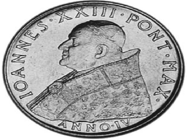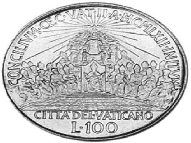 Il Concilio ecumenico Vaticano II è stato il ventunesimo e ultimo concilio ecumenico. Il Concilio riunì tutti i vescovi del mondo (2480) per discutere di argomenti riguardanti la vita della Chiesa cattolica. Si svolse in nove sessioni e in quattro periodi, dal 1962 al 1965, sotto i pontificati di Giovanni XXIII (Papa Roncalli) e Paolo VI (Papa Montini). Promulgò quattro Costituzioni, tre Dichiarazioni e nove Decreti. L'annuncio dell'indizione di un concilio venne dato da Giovanni XXIII il 25 gennaio 1959, a soli tre mesi dalla sua elezione al soglio pontificio, nella basilica di San Paolo, insieme all'annuncio di un sinodo della diocesi di Roma e dell'aggiornamento del Codice di Diritto Canonico. Il Concilio fu aperto ufficialmente l'11 ottobre 1962 da papa Giovanni XXIII all'interno della basilica di San Pietro in Vaticano con cerimonia solenne. Giovanni XXIII, al secolo Angelo Giuseppe Roncalli, nacque a Sotto il Monte (BG), il 25 novembre 1881, venne eletto Papa il 28 ottobre 1958 e morì in Città del Vaticano, il 3 giugno 1963 . In tale occasione pronunciò il celebre discorso Gaudet Mater Ecclesia (Gioisce la Madre Chiesa).Nell’occasione (1962) l’Ufficio filatelico e numismatico dello Stato Città del Vaticano autorizzò presso la Zecca di Roma ( IPZS ) la coniazione di 1.566.000 pezzi FDC della nuova moneta da Lire 100 con contorno rigato in acmonital con un diametro di 27,8 mm del peso di grammi 7,9 asse di conio "alla francese", cioè ad ore 6. Al diritto la moneta porta in tondo la legenda” IOANNES•XXIII•PONT•MAX• - ANNO•IV”.Al centro nel campo il mezzo busto rivolto a sinistra di Giovanni XXIII con berretto e piviale. Sotto il piviale, la firma dell’ incisore Pietro Giampaoli. Al rovescio troviamo in tondo la legenda “CONCILIVM•ŒC•VAT•II•A•MCMLXII•INITVM “in esergo CITTA' DEL•VATICANO/L•100 su due righe.Nel campo al centro Il Papa, assiso di fronte sul trono di Pietro, con mitria e piviale, in alto la colomba raggiata simbolo dello Spirito Santo, che aleggia sopra il pontefice in trono e le due ali di vescovi che formano l'assemblea dei Padri conciliari seduti, sullo sfondo baldacchino del Bernini. La moneta è molto comune per il suo valore venale che si aggira intorno a pochi euro, tranne per l’altissimo valore storico dell’evento.
