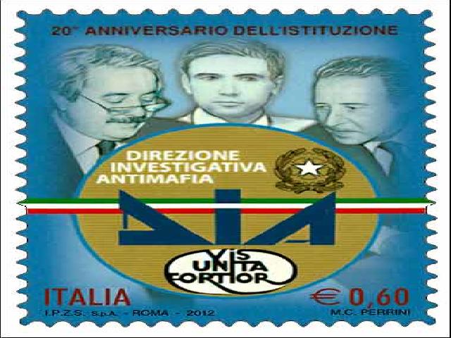 Il 21 settembre 2012 l’amministrazione postale ha voluto ricordare il 20° anniversario della nascita della DIA con l’emissione di un francobollo policromo. La tiratura è stata di 2.610.000 pezzi. IL francobollo su bozzetto di Maria Carmela Perrini riproduce il logo della Direzione Investigativa Antimafia e i ritratti di Giovanni Falcone, Rosario Livatino e Paolo Borsellino. Completano il francobollo la leggenda “20° ANNIVERSARIO DELL’ISTITUZIONE”, la scritta “ITALIA” e il valore “€ 0,60”.La stampa in rotocalcografia è stata realizzata presso l’ Istituto Poligrafico e Zecca dello Stato S.p.A., su carta bianca, patinata neutra, autoadesiva, non fluorescente. Il francobollo ha una dentellatura da 11 effettuata con fustellatura e un formato di mm 37 x 46. “DIA” è la sigla della Direzione Investigativa Antimafia. Organismo istituito con D.L. 29 ottobre 1991, n. 345 (convertito con legge 30 dicembre 1991, n. 410), nell'ambito del Dipartimento della Pubblica Sicurezza con il compito di assicurare lo svolgimento coordinato delle attività di investigazione preventiva relative alla criminalità organizzata e di effettuare indagini attinenti esclusivamente a delitti di associazione di tipo mafioso o a questi ricollegabili.I tre eroi che campeggiano sono da sinistra Giovanni Falcone, (Palermo 1938-1992). Laureato in giurisprudenza, iniziò la sua attività di magistrato a Lentini . Trascorsi dieci anni al tribunale di Trapani, passò a quello di Palermo. Le lunghe indagini di Falcone sulla mafia, sfociarono, con la collaborazione del collega Paolo Borsellino, nel primo maxiprocesso contro Cosa nostra, celebrato a Palermo nel 1986, in cui venne condannata l'intera cupola mafiosa. Nel 1989, dopo essere sfuggito a un attentato dinamitardo, venne nominato procuratore aggiunto di Palermo. Nel 1991 venne chiamato alla guida della Direzione generale degli affari penali. Fu ucciso, nel 1992, dalla mafia in un attentato sull'autostrada Punta Raisi-Palermo. Con lui morirono anche la moglie e tre agenti della scorta.Al centro, Rosario Livatino, conosciuto come il giudice ragazzino, assassinato dalla mafia sotto il regime della corruzione (1992). A destra Paolo Borsellino (Palermo 1938-1992). Magistrato del pool antimafia di Palermo, Borsellino proseguiva la sua carriera a Marsala per rientrare a Palermo come procuratore aggiunto. Profondamente colpito dalla morte dell’amico e collega Falcone (maggio 1992), intensificava il suo impegno tanto da diventare il nuovo simbolo della lotta dello Stato contro la criminalità mafiosa. Ma Borsellino era ormai entrato nel mirino di Cosa nostra, che ne ordinava l'uccisione. Moriva, in un attentato insieme a cinque agenti della sua scorta il 19 luglio 1992.