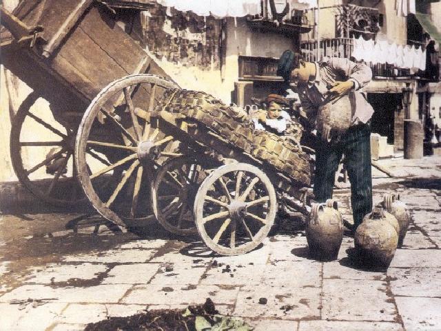 Questo mestiere nei nostri tempi ha conosciuto una nuova fioritura, infatti gli esercizi commerciali che vendono acque minerali, liscie o gassate,sono cresciuti a dismisura su tutto il nostro territorio nazionale. Essi assicurano non solo la vendita ma anche la consegna a domicilio dei vari fardelli. Ebbene una volta, quando non c’era l’Acquedotto Pugliese che erogava, seppure solo alle fontane, l’acqua potabile, si ci rivolgeva per l’acquisto all’acquajule. L’acquajule andava in giro con un carro trainato da un mulo o da un cavallo, con sopra della botti in legno pieni di acqua che regolarmente vendeva ad un prezzo irrisorio che oggi definiremmo“sociale”. L’acqua che si acquistava serviva prettamente per bere e cucinare. I meno abbienti prendevano l’acqua presso i molti pozzi cittadini privati e pubblici dove l’acqua era buona da bere. Al suo arrivo in piazza si creava un vero passa parola … è arrivàt l’acquajule… currìte a pighjà ì secchje. Quasi sempre l’acqua era riempita in grossi vasi di argilla cotta ( ì Saròle). A riempire l’acqua venivano mandati i ragazzi e i giovani per la loro prestanza. Di solito si creava una lunga fila e molte volte qualcuno più rissoso diventava insofferente per cui scoppiavano liti con relativi alterchi. Per la lavatura dei panni, vista la quantità di acqua necessaria si andava “ à Jummàre”. Questo mestiere all’avvento dell’erogazione idrica dell’acquedotto era quasi sparito ma dagli anni 80 con la riscoperta delle salutari acque minerali, ha dato un forte impulso all’economia sia sul lato puramente commerciale che su quello industriale. Si tratta inoltre di un mercato derivante da un "bisogno indotto", sostenuto dall'incessante pubblicità televisiva e cartacea ( vedi Rocchetta, Ferrarelle, Gaudianello, Fiuggi,Lete, Levissima Ecc. ecc.), che conferisce proprietà "quasi miracolose" alla costosissima acqua imbottigliata. Alle varie acque minerali sono di volta in volta attribuite particolari proprietà nutritive o terapeutiche che l'acqua del rubinetto non dovrebbe possedere. In realtà l'acqua di rubinetto distribuita negli acquedotti cittadini è di ottima qualità, anche superiore a quella delle acque in bottiglia , soprattutto per i controlli effettuati.