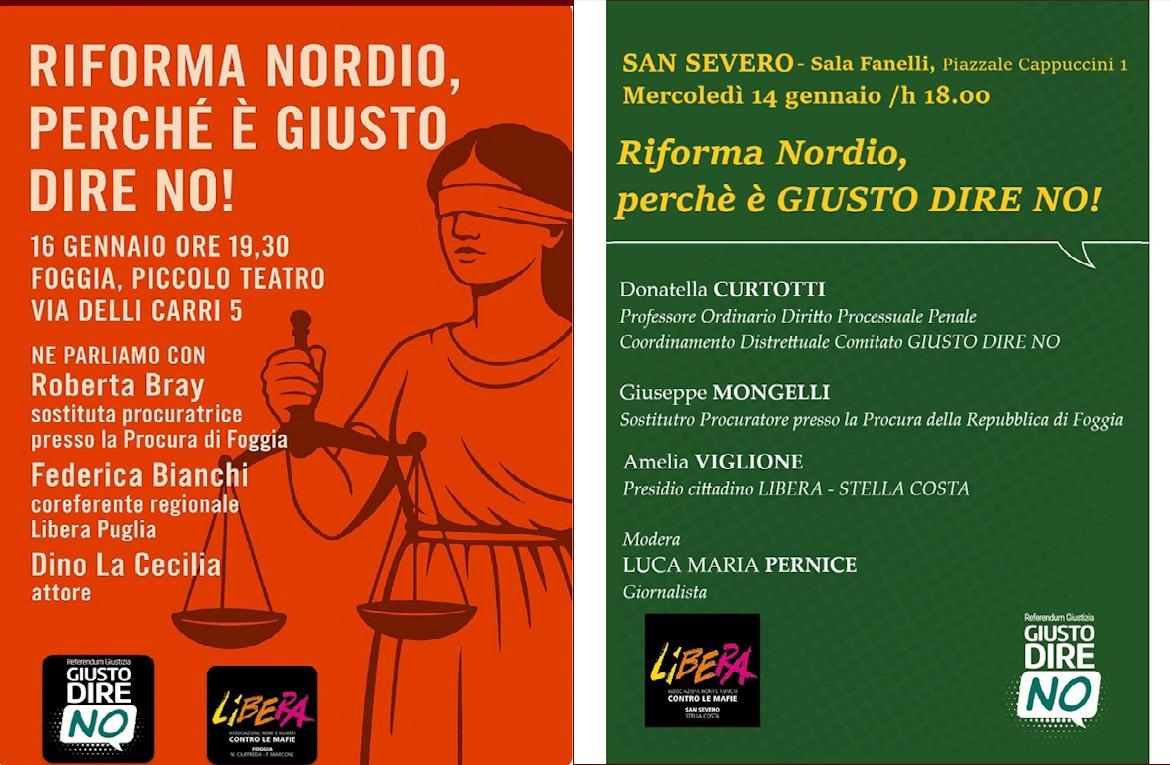 Libera, presidio di San Severo e Presidio di Foggia, e Comitato GIUSTO DIRE NO, insieme per due dibattiti dal titolo “Riforma Nordio. Perché è giusto dire NO”.