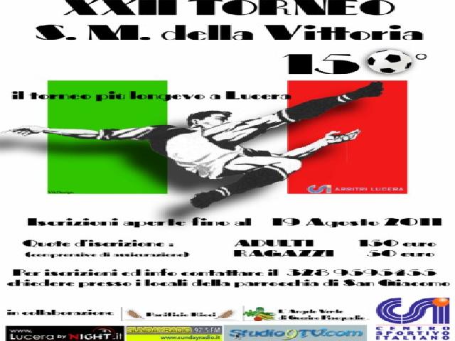 Sono aperte le iscrizioni per la 22^ edizione del torneo di calcio a 5 in onore di "Santa Maria della Vittoria". La manifestazione sportiva promossa dalla Parrocchia San Giacomo Mag. Ap. e organizzata dal Circolo Sportivo e Culturale P.G. Frassati è di fatto, con le sue 22 edizioni, il torneo più longevo di Lucera. Dopo la novità 2010 del nuovo campo in erba artificiale, la novità 2011 è nelle celebrazioni